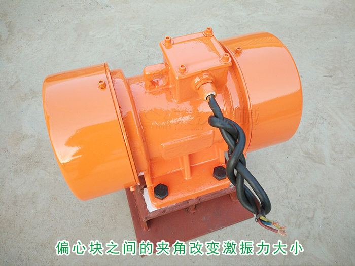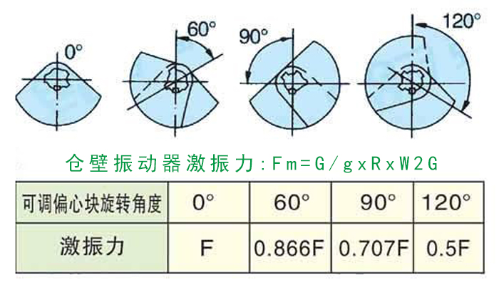 仓壁振动器上的振动电机分为固定偏心块和可调偏心块,通过调节两端偏心块之间的夹角改变激振力大小。设备出厂时偏心块之间的夹角为0度,可将激振力大小调整为相对应的可调偏心块旋转角度60度 、90度 、120度对应激振力大小分别为0.866 、0.707 、0.500。