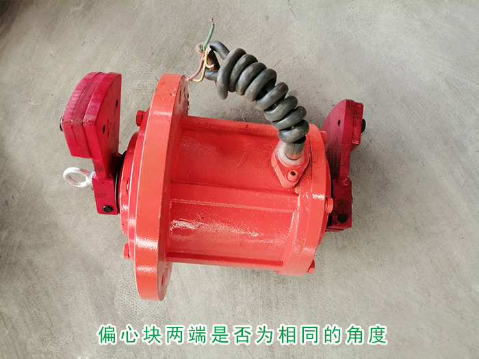 拆除仓壁振动器振动电机防护罩后旋松外侧偏心块,加紧螺栓使两侧偏心块向同方向转动,使电机轴上的上刻线对准偏心块激振力示值线至需要的数值处,并检查偏心块两端是否为相同的角度。