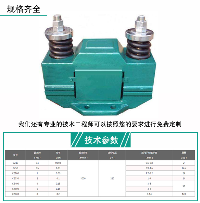 大汉生产的电磁仓壁振动器型号包括:CZ10、CZ50、CZ100、CZ250、CZ400、CZ600、CZ800等,每种型号的电磁仓壁振动器功率不同,振动力大小也是不同的,所以用户应该根据自身情况进行选择,如果您不知道如何选择,可以随时咨询新乡大汉厂家,或者我们的电磁仓壁振动器无法达到您的要求,你也可以随时咨询我们厂家,我们有专业的技术工程师可以按照您的要求进行免费定制。